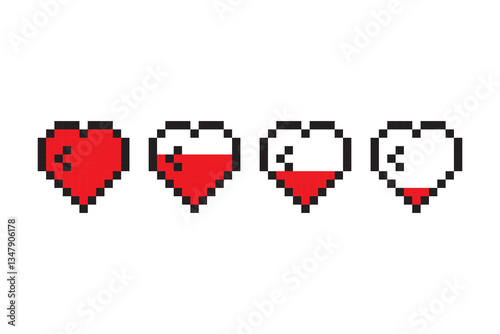 Pixel heart icons. Partial love meter. Vector health symbol. Retro red style.