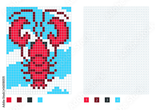 Pixel lobster cartoon in the coloring page with numbered squares, vector illustration