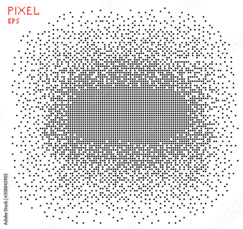 Pixel mosaic explosion. Effect, dissolution, monochrome fine particles, squares. Indent, place for text, banner, poster. Vector element isolated background.