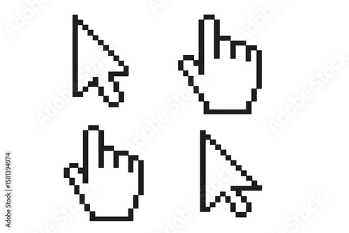 Pixel Mouse Cursor Icons Set. Hand Pointer and Arrow Cursor Collection. 3D Shadow Effect. Pixel Art Computer Mouse Pointer. Vector and Transparent PNG. UI UX Web Design Elements