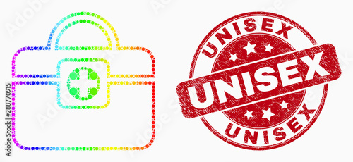 Pixel spectrum medical handbag mosaic pictogram and Unisex watermark. Red vector round grunge watermark with Unisex message. Vector collage in flat style.