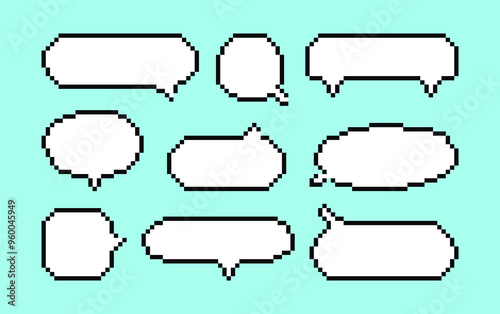 Pixel white Speech Bubbles set for computer game. Message box, chat empty retro clouds in 8 bit art, icons. Comic blank elements for dialogues of discussion and thoughts.