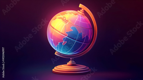 Pixelated Globe Shining With Pink and Yellow Light Standing on a Pedestal Against Dark Background