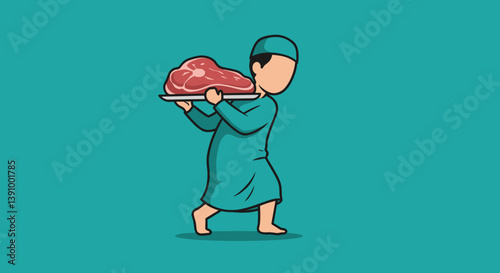 Pixelated Illustration Of A Muslim Man Carrying A Tray Of Raw Meat In Teal And Brown Colors