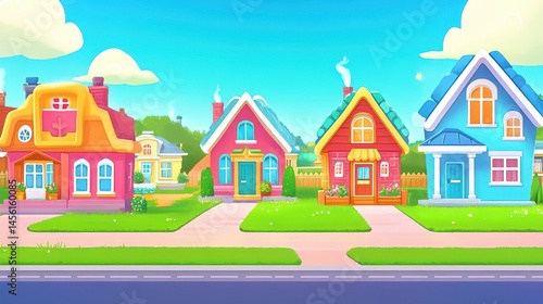 Pixelated Neighborhood Bliss, Colorful Houses, Serene Sky and Lush Greenery in a Retro Gaming Style Landscape Scene