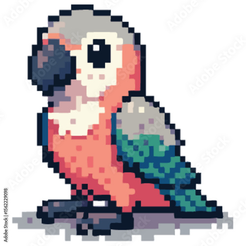 Pixelated parrot illustration with pink chest, gray head, and dark blue beak, standing on its feet.
