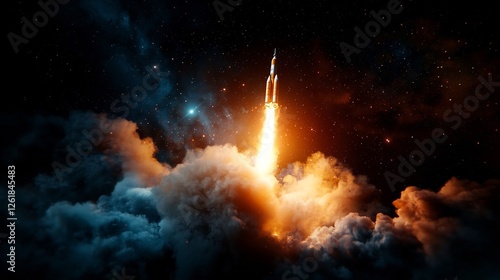 Pixelated Rocket Ascending Through Orange Blue Nebula with Starry Night Sky