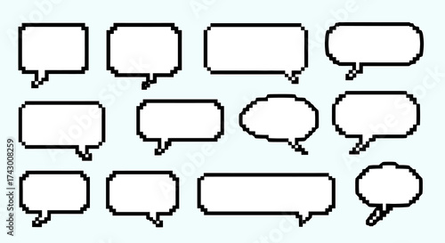 Pixelated speech bubbles in assorted shapes outlined in black on a light background