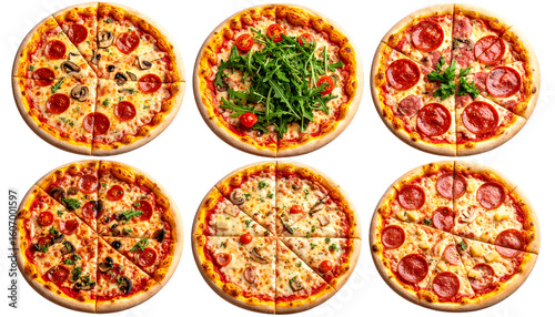 Pizza , margharita, pepperoni, arugula, funghi and hawaii, isolated on a transparent or white background