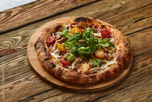 Pizza Caesar. Pizza with chicken, tomato, cheese and lettuce on wooden board. Top view. Free space for your text. Delivery food