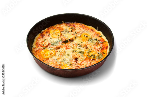 Pizza cooked at home. Baked in an iron pan. Isolated on a white background.