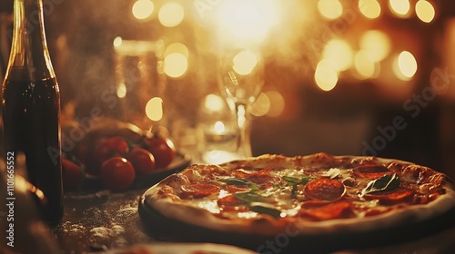 Pizza dinner gathering with loved ones, featuring a delicious pepperoni pizza, bright bokeh lights, and warm ambiance with cozy copy space.