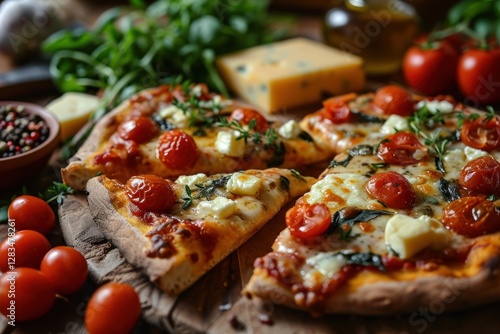 Pizza Four Cheese, Italian Pizza with Rich Tomato Sauce, Mozzarella, Parmesan, Gorgonzola, and Ricotta Cheese, Creamy and Savory Pizza Isolated on Background with Copy Space.