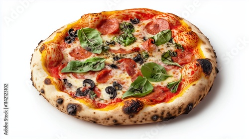 Pizza isolated. White background, mozzarella cheese, pizza slice, tomato, pizza ingredients, healthy, gourmet, fresh, tasty, baked.