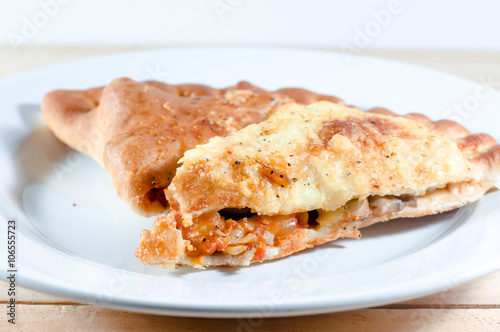 pizza puff on white plate over wooden background