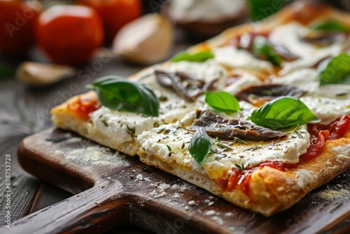 Pizza slice with ricotta anchovies and basil Focus on specific toppings