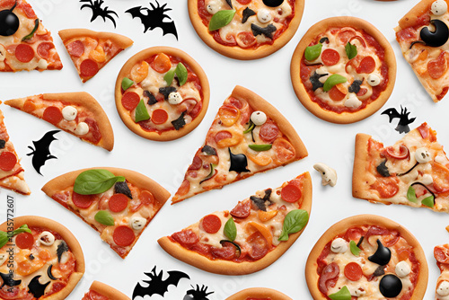 Pizza with decorations for Halloween, created with Generative AI technology.