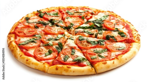 Pizza with fresh tomato, basil, and mozzarella, isolated on white background, showcasing its vibrant toppings and Italian-inspired simplicity