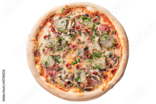 Pizza with salami, ham, sausage, mushrooms, pickled cucumbers and tomato sauce. View from above