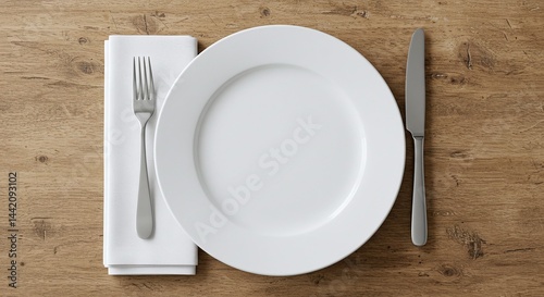 Place setting with white plate, fork and napkin, and knife on wooden table