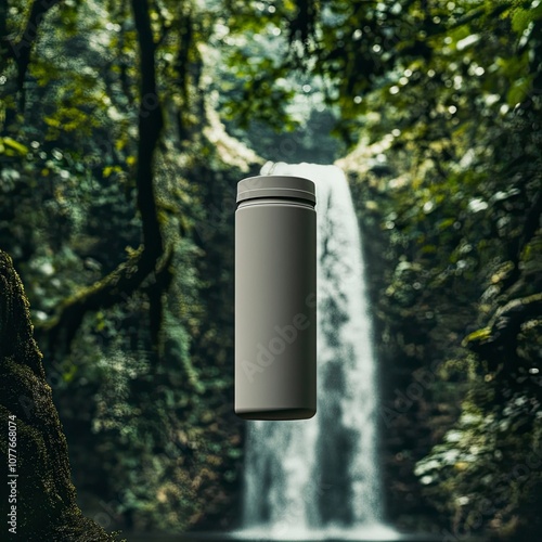 Plain Matte light grey supplement canister, cylinder shape, vertical large can hovering in air, tilted up slightly, facing camera, jungle tree tops, green, generative ai