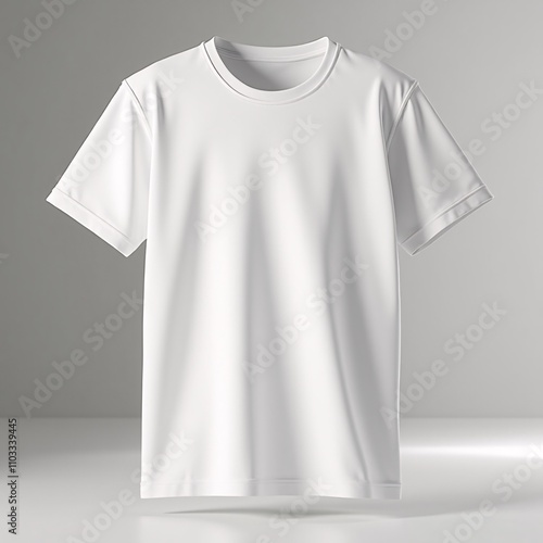 Plain white t-shirt, made of soft fabric with thick round collar, displayed on a flat surface in studio lighting. Suitable for mockup design