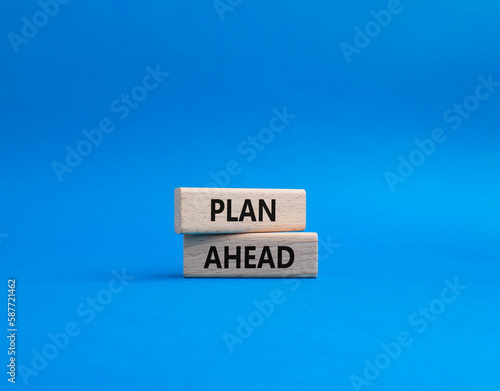Plan ahead symbol. Wooden blocks with words Plan ahead. Beautiful blue background. Business and Plan ahead concept. Copy space.