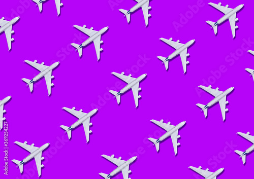 Planes patttern on purple background with top view and copy space. Travel background for travel agency banner. Flat lay. Minimalism travel concept.