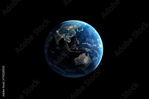 planet Earth at night, as seen from space. The image is dominated by the blue and green continents of Earth, which are illuminated by the soft light of the setting sun
