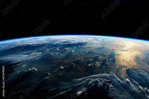 Planet earth from universe, orbital view of the world, lit planet with sun in the background