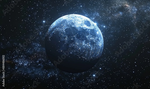 Planet in space. Starry blue ball with glowing stars and flares on surface surrounded by universe and galaxies