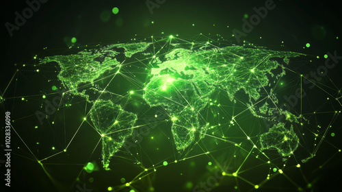 Planet map. Global social network. The future. Vector. Green futuristic backdrop with Earth. Technology and the internet. Floating green plexus geometric pattern.