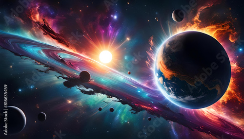 Planeten Monde Sonne Sterne in bunt leuchtenden Galaxien ferner Welten Weltall All Kosmos, Phänomene des Universum, kosmische Stürme, Flammen Feuer und Energie unendlicher Weiten, Hintergrund Vorlage