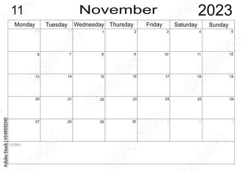 Planner for November 2023. Schedule for month. Monthly calendar. Organizer