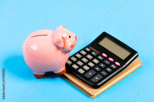 planning counting budget. Commerece business. bookkeeping. financial report. capital management. money saving. Accounting and payroll. moneybox with calculator. Piggy bank. Financial aid