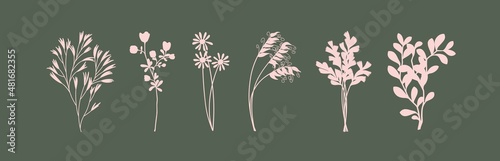 Plant silhouettes. Bouquets of different branches, herbs and flowers. Set of vector design elements. Trendy minimalistic art