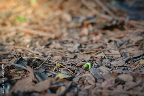 Plant tree growing on dried leaves ground.