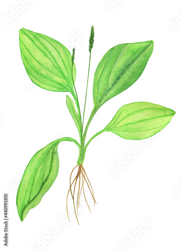 Plantain plant with root isolated on white background. Watercolor hand drawing illustration. Perfect for medical design, herbal card.