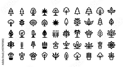 Plants Line Icon Set – Thin Linear Vector Pictograms of Tree, Forest, Bonsai, Cactus, Aloe Vera, Monstera, Maple Leaf, and Succulent