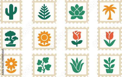 Plants Postage Stamps Icon Set – Flat Solid Color Vector Illustrations