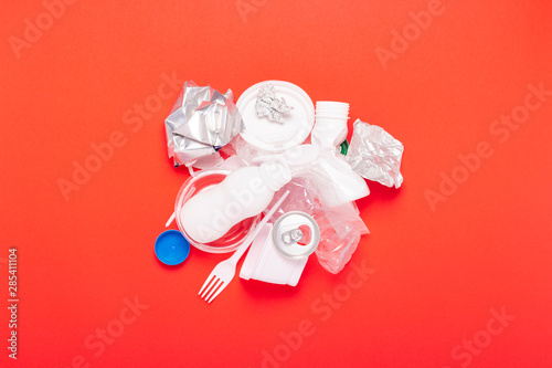 Plastic and tin waste collection on a red background. Concept stop plastic, recycling, separate collection of garbage. Flat lay, top view