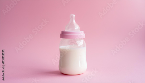 Plastic baby milk bottle on pink backdrop. Feeding time.