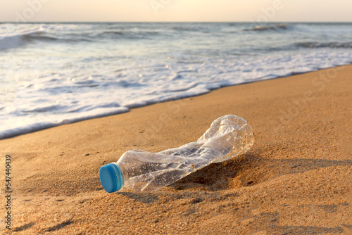 Plastic bottle garbage waste ying on sand beach, garbage rubbish on beach and marine sea pollution concept.