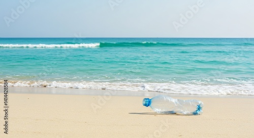 Plastic bottle waste on beach sand with ocean waves and blue sky in background on a sunny day view
