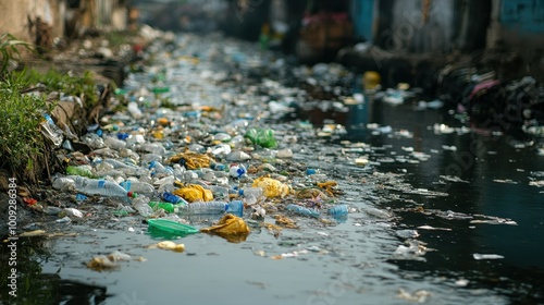 Plastic bottles and other debris litter a polluted waterway.