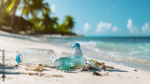 Plastic bottles and trash washed up on a pristine beach, symbolizing the human impact on natural environments.