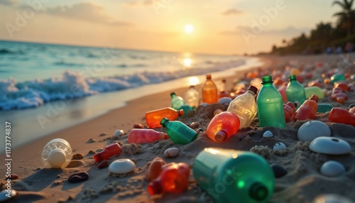 Plastic bottles trash beach at sunset. Ocean waves crash on shore. Pollution problem. Sunrise sunset. Environment in danger. Eco issues. Nature destruction. Sad situation. Discarded plastic bottles