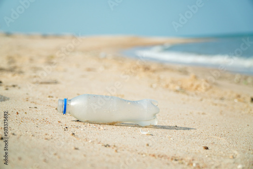 Plastic bottles were left for a long time on the white beach.plastic bottle recycling idea