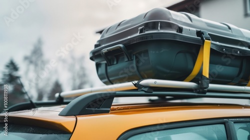 plastic luggage compartment in car roof box. camper van long journey concept