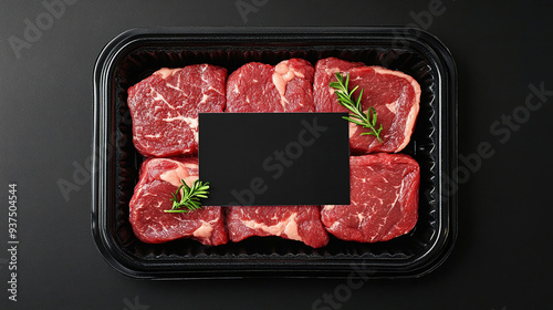 Plastic packaging of beef with a blank black space for product labelling, advertisement.